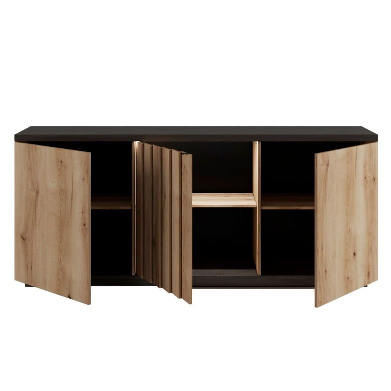 Aparador de design moderno com 3 portas espaçosas, oferecendo grande capacidade de arrumação. Possui um tampo robusto de 38 mm para maior resistência e iluminação LED integrada que acrescenta elegância ao ambiente. Ideal para uma sala sofisticada, organizada e funcional.