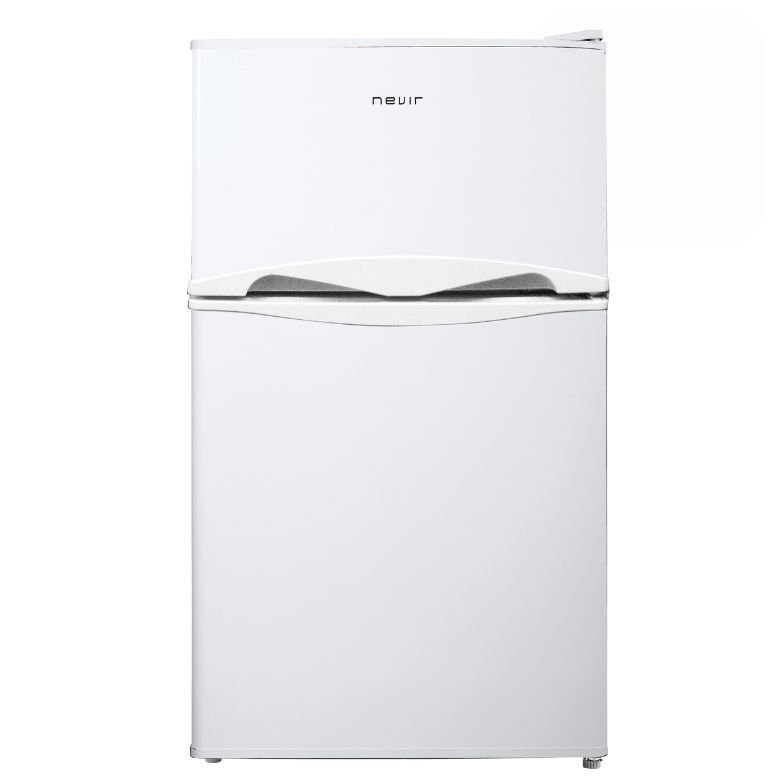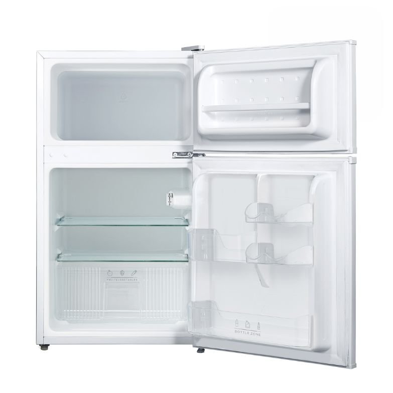 Frigorifico branca com porta dupla, 50 cm de largura, luz interna e eficiência energética Classe N/ST. Compacto e prático, ideal para cozinhas pequenas, oferecendo organização e fácil acesso aos alimentos.