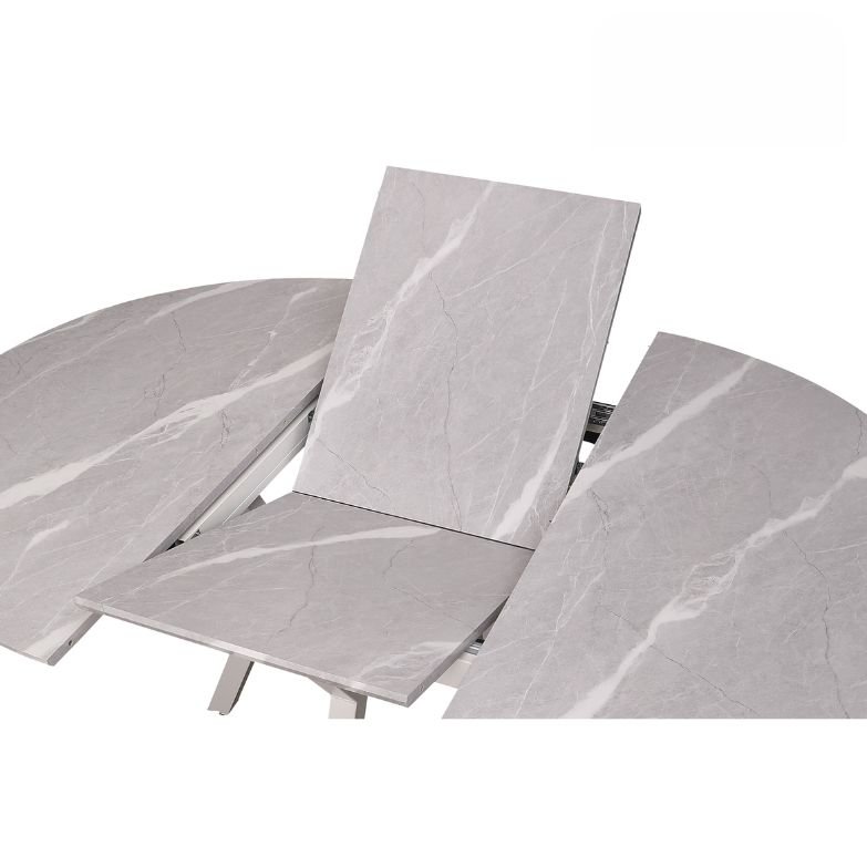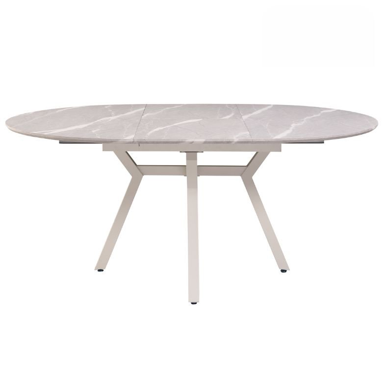Mesa de jantar redonda extensível ideal para otimizar espaço com estilo e funcionalidade. Fechada mede 130 cm e estende-se facilmente até 180 cm, acomodando mais pessoas com conforto. Possui um compartimento interno prático para guardar a extensão sob o tampo. Tampo resistente em MDF de 22 mm com revestimento em papel laminado 3D, fácil de limpar e durável. Estrutura estável com pés em metal branco, perfeita para salas de jantar modernas.