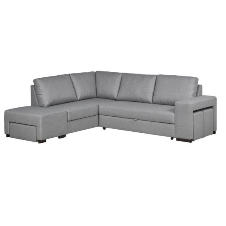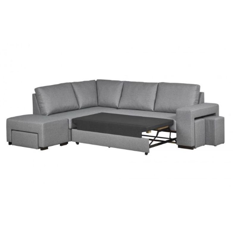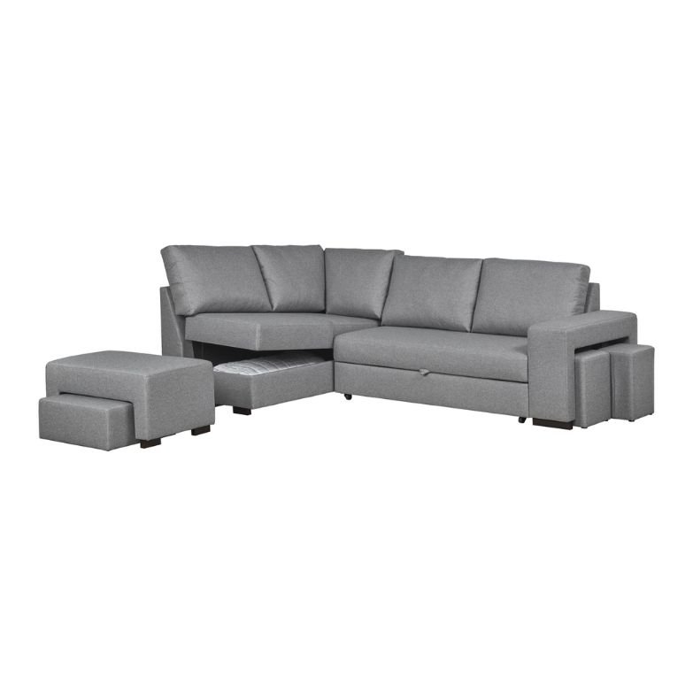 Sofá de canto cinza com cama, arca integrada e pufes, perfeito para quem procura conforto, funcionalidade e estilo moderno. Disponível com terminal à direita ou à esquerda, adapta-se facilmente a qualquer sala. Oferece ampla capacidade de arrumação, materiais de alta qualidade e acabamento elegante. Transforme o seu espaço com este sofá versátil em promoção por tempo limitado!